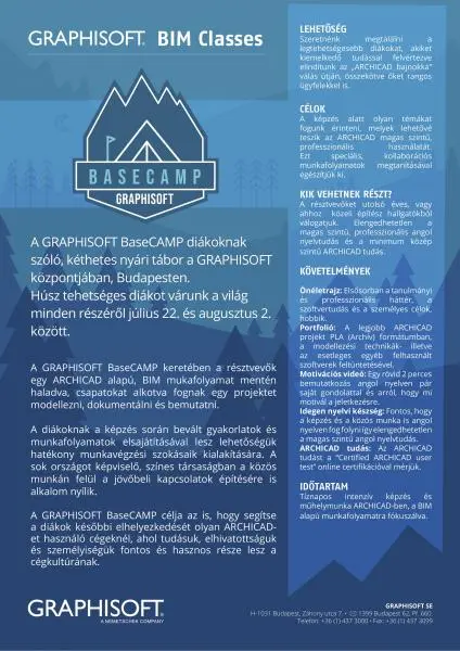 A GRAPHISOFT BaseCAMP diákoknak szóló, kéthetes nyári tábor a GRAPHISOFT központjában, Budapesten, melyen húsz diák fog részt venni a világ minden részéről július 22. és augusztus 2. között. A tábor keretében a résztvevők egy BIM munkafolyamat mentén haladva, csoportokban fognak egy projektet modellezni, bemutatni.