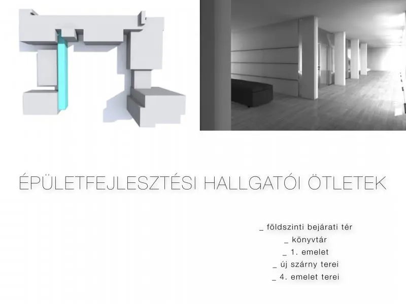 Épületfejlesztési hallgatói ötletek A félév során a negyedéves tervezési tantárgy keretében a hallgatók a Műszaki Kar épületének belső tereivel foglalkoztak. 5 fókuszpont mentén kerestek fejlesztési lehetőségeket, kis lépétékű beavatkozásokra tettek javaslatokat, melyek a hallgatók egyetemen töltött idejének sokszínűbb és minőségibb eltöltésére adhat majd lehetőséget. |