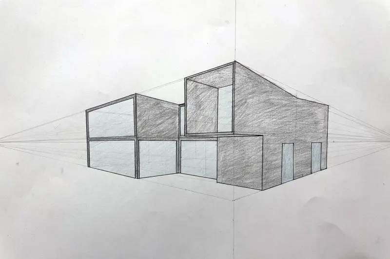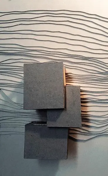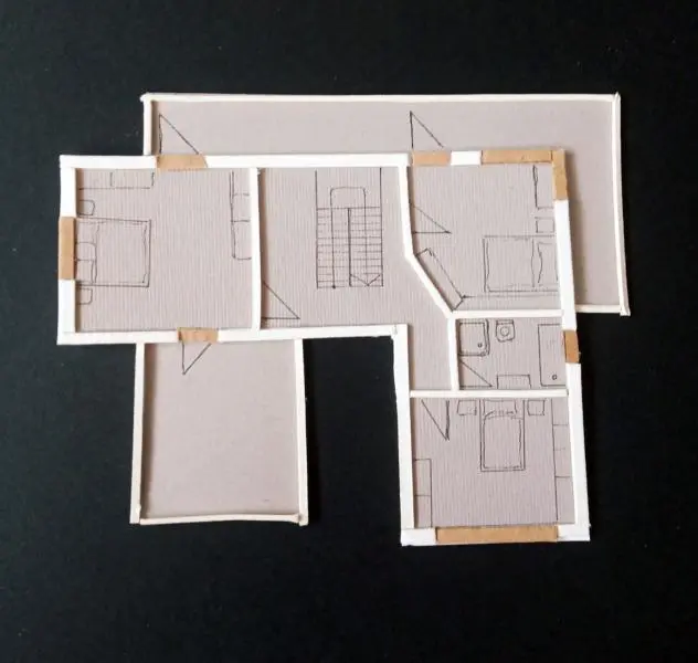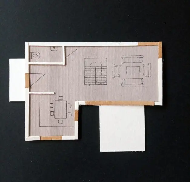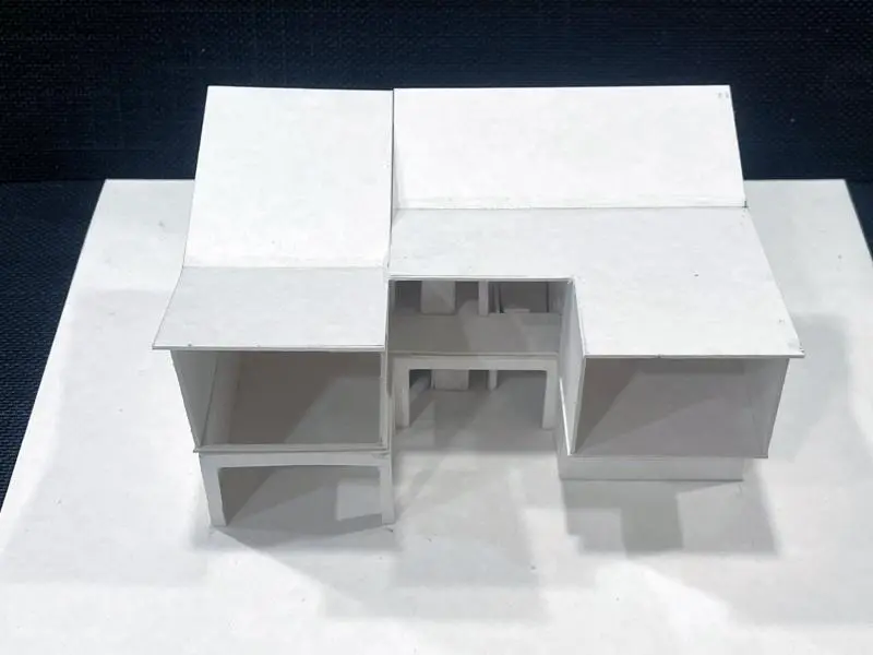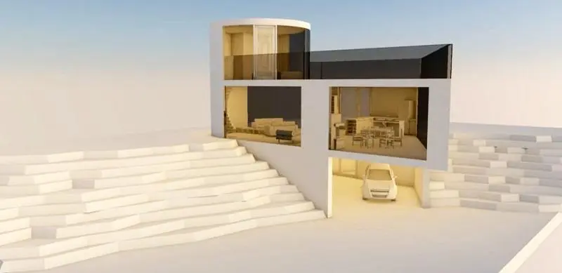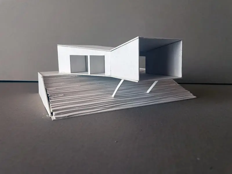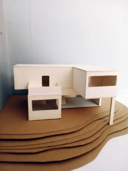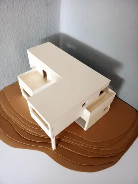 A képből, ami megragadott az az épület tagoltsága, ezért egy sokoldalú, tagolt formát akartam létrehozni. Elsőként az épület külsejét, formáját találtam ki, célom volt egy formálható és sok lehetőséget magába rejtő téri koncepciót létrehozni, amiből aztán könnyű megtalálni a legjobb irányt. Az épület így két egymástól elforgatott „L” alakból tevődik össze, közepén egy lépcsővel. Nagy megnyitásokkal van ellátva. A földszinten van a konyha, nappali, étkező, tehát a társasági élet terei egy mellékhelyiséggel kiegészítve. Az emeleten vannak a hálószobák és a fürdőszoba (privát terek). |