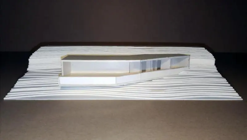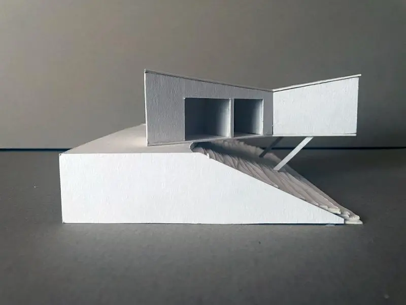 Az épületünket egy adott környezetbe kellett behelyezni és ahhoz igazítani. Én egy olyan képet kaptam, amin egy fás hegyoldal volt látható. Ebbe a környezetbe igyekszik beleolvadni és eggyé válni a megtervezett tömeg. Több alapkoncepció is tervben volt, valamelyik a hegy oldalába, van amelyik a hegybe és volt olyan, amelyik a hegy vonalát követte megtörve a hosszú elnyúlt alakzatot. Az eshetőségek közül egyikre sem esett a választás, mert a végén össze lettek kombinálva a dolgok. Mindegyik tervből kiragadtunk egy keveset és ezáltal az épület egy része kilóg a hegyből, egy része rajta van a hegyen és egy része pedig benne van a hegyben. Nehéz volt a belső tér kialakítása a váltakozó épület részek miatt, de sikerült élhetően kialakítani. A terv területének nagy részén a bútorokkal lettek a terek kialakítva, mint az étkező, konyha, nappali részleg. A ház hosszabb szakaszán ki lett alakítva egy terasz, ami belesimul a terv vonalaiba. Az épület egész hosszában szinte nyitott a nagy üvegfelületnek hála, ami jó kilátást biztosíthat akárhonnan is nézünk ki az épületből. |