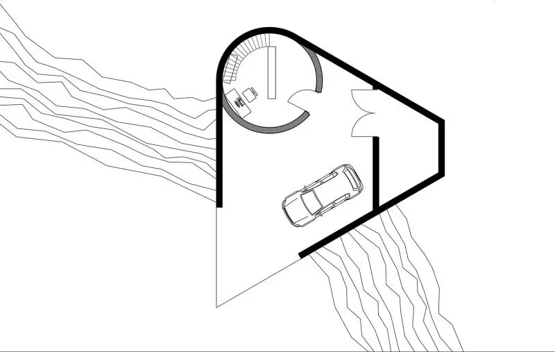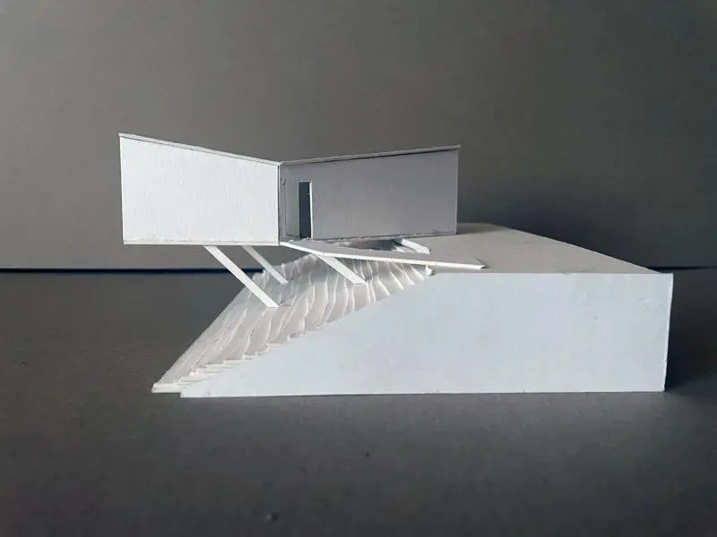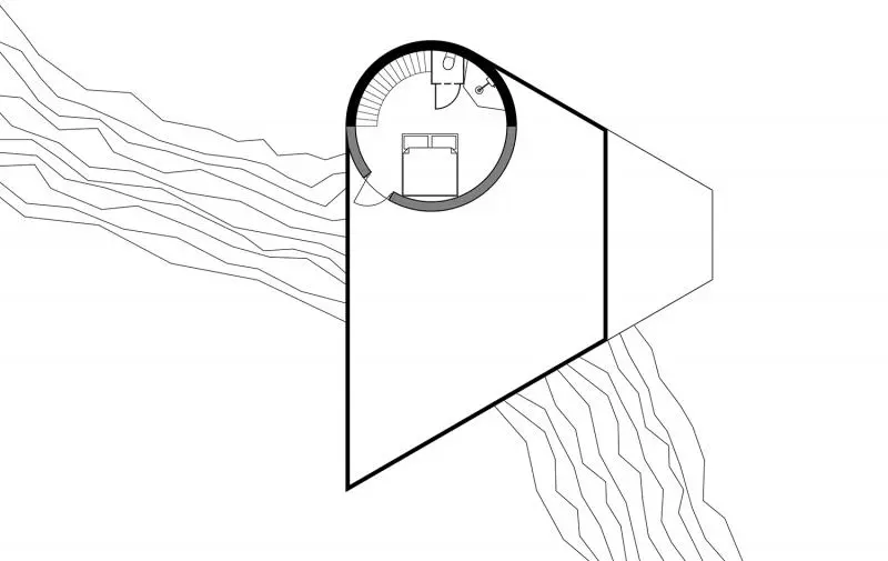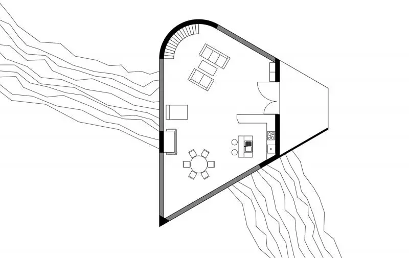 A cél elsődlegesen az volt a tervezés kezdetekor, hogy a környezettel teremtsen a ház fizikai és szellemi kapcsolatot. A tervezett ház egy egyszintes lakóház, egy tó partján, ami egy domb alján helyezkedik el. Tehát egy erdős, lejtős, köves környezet. A ház is ehhez igazodik azzal, hogy három kis „tömbből” áll, ezzel asszociál a kövekre, a ház eleje lábakon áll, amivel a fákra hivatkozik. A természetközeliségét növeli a ház függőleges külső faburkolata is. A három kis „tömb” kisebb szinteltolással csatlakozik egymáshoz lépcsőzetesen, ami épp annyit emelkedik, amennyit a domboldal. A lakás egy, maximum két ember számára kényelmesen lakható. Minden irányba nagy ablakokkal van ellátva, így ezzel is növelve van a kapcsolat kint és bent között. A nappali kifejezetten tágas és három irányba nyúló ablakával csodálatos panorámát nyit a tóra, illetve a domboldalra. |