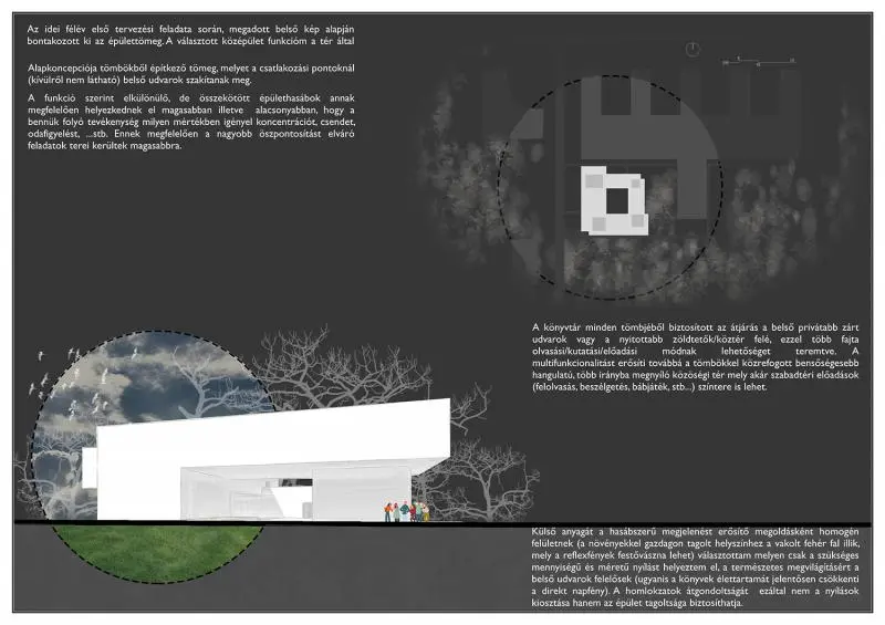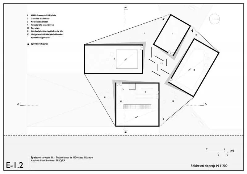 Az első tervfeladat kiosztása alkalmával a helyszínt magunk választhattuk ki a tervezett épületnek, ami az én esetemben Debrecen belvárosában, a Nagyállomás közelében található szabad tisztáson kapott helyet. A szomszédos épületekhez és azok tulajdonságaihoz alkalmazkodva, egy középület tervezése volt a feladat, pontosabban kaptunk egy meglévő téri csatlakozást ábrázoló belső képet és ezt kellett úgy kialakítani az általunk tervezett épületben, hogy az funkcionális és élhető legyen, továbbvive az egész épületben a képen megjelent szervezőelvet és építészeti logikát. A választott helyszínen az épület könnyen megközelíthető, emiatt lehetővé vált egy hosszabb rámpa kialakítása az épület könnyed megközelítésének érdekében, ami a többszintes múzeum alagsorába vezet, hiszen itt helyezkedik el a fogadó-tér, ami megemeli az épületet, hiszen a megérkező tér belmagassága "kiugrik" a földből, amivel lebegés érzetet kelt. Az épület tervezésekor figyelembe véve a kiosztott képen látható szervező elvet, a múzeum kívülről tömör kubusnak hat, mivel a bejáraton kívül nem rendelkezik más homlokzati nyílással, hiszen a megvilágítása a tereknek nem a szokásos módon jött létre, hanem felülvilágító kürtők beépítésével, ami néhol több szintet is áttör. Ezzel megalkotva egy változatos, egymástól különböző és játékos alaprajzot, ami szokatlan szerkezetet és belső látványt eredményez. |