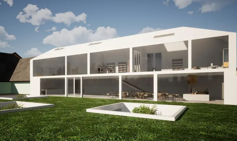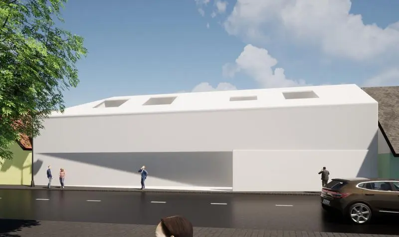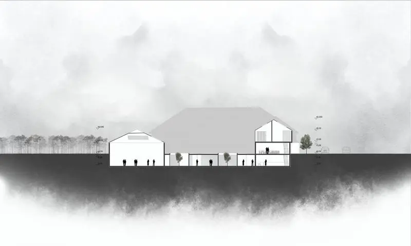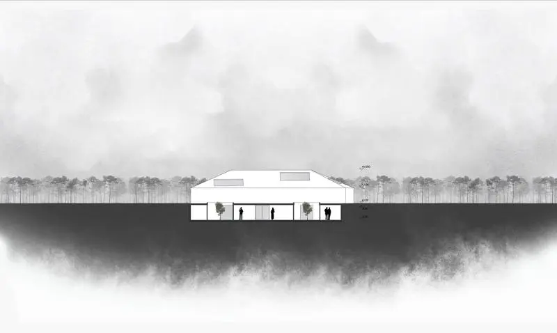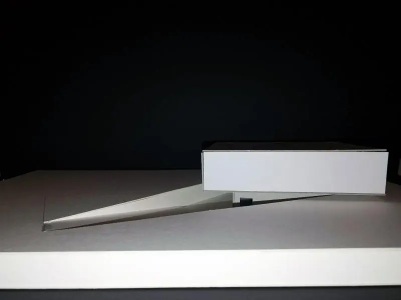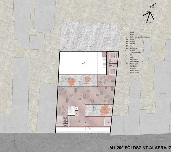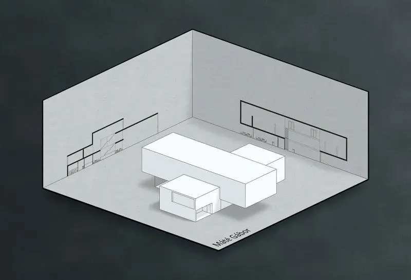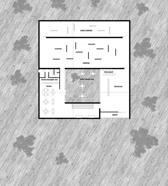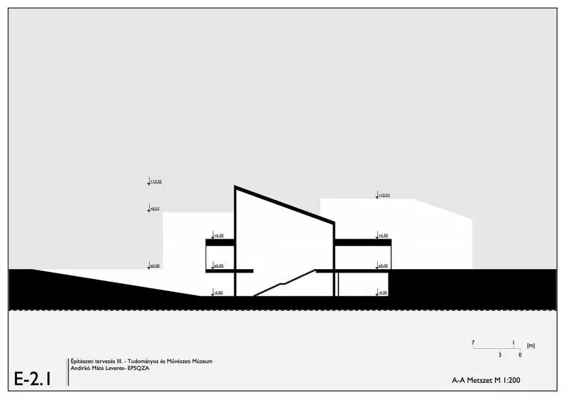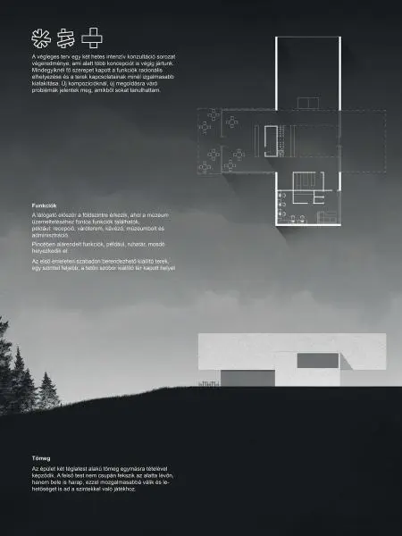 Fontos volt, hogy tömegében meggyezzen a környező épületekkel, viszont stílusában a modern kort tükrözze. Ezért került kialakításra szemből nézve egy teljesen zárt homlokzat és egy túlnyúlás nélküli tetőszerkezet. A bejáratot egy kinyúlás takarja el, ami titokzatossá és moderné teszi a front homlokzatot. Viszont a hátsó homlokzat teljesen nyitottá tétele volt a célom, ami kilátást biztosít az átriumokra és a kiállító helységre. A földszinten került kialakításra egy recepció, és a vendégek számára található ruhatároló, és illemhelyiségek, valamint egy raktár. A zárt kiállító helyiség előtt egy recepciót alakítottam ki, ahol a vendégek papírjait lehet ellenőrizni és ezt követően mehetnek tovább. A zárt kiállítótérben 5 különböző átriumot alakítottam ki, ami biztosítja a természetes megvilágítást. Tovább haladva elérkezünk egy nyitottabb kiállítótérhez, aminek nagy belmagassága és az ég felé nyitott tető, biztosítja a fényt. A főépület emeletén kerületek kiépítésre az irodák, ehhez biztosított illemhelységek és raktár, valamint egy nyitott tető. |