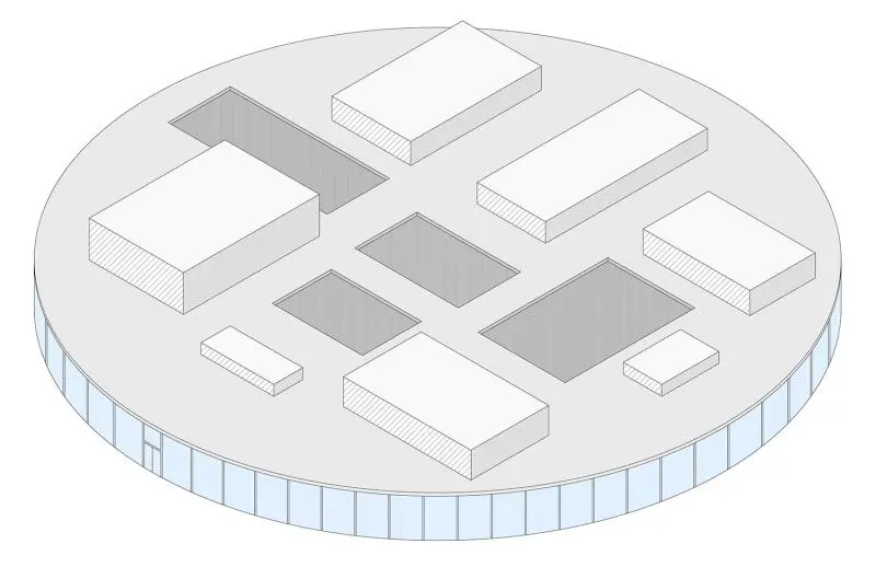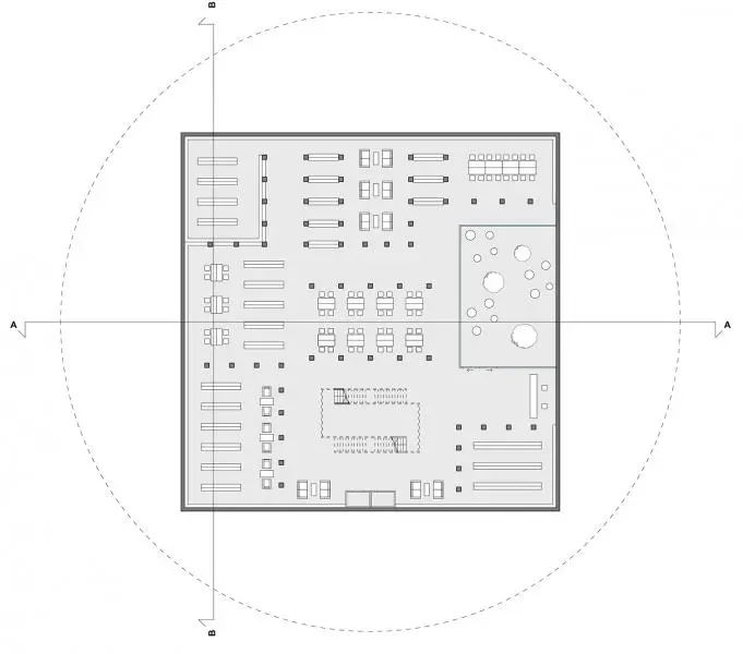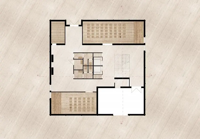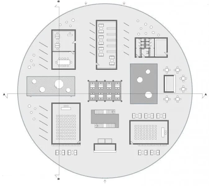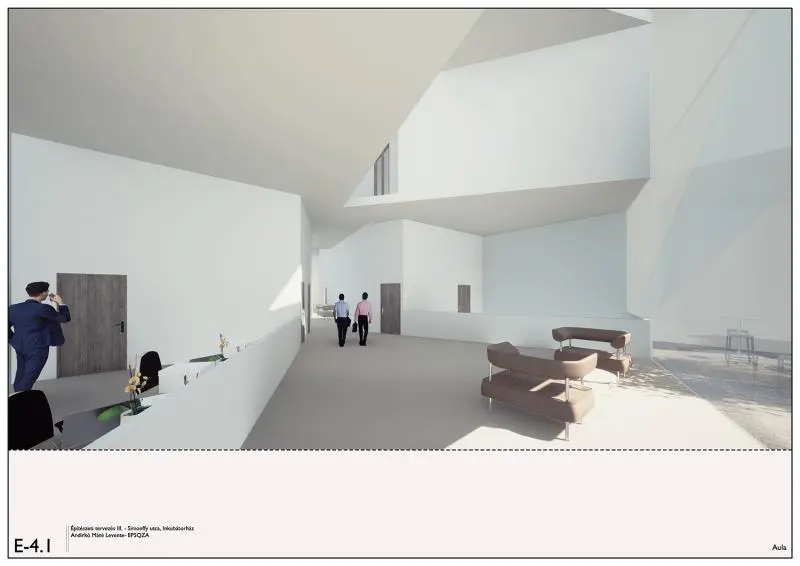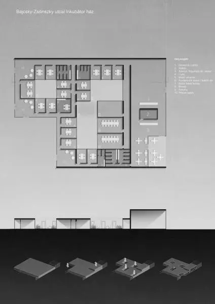 Az épület funkciója szerint inkubátor ház. Az utcafronton található nagyobb tömeg ad helyet a megérkezésnek, lobbynak és recepciónak, e mellett pedig a kávézó helyezkedik el. E két funkció mögött az átriumok köré szerveződő irodákat találjuk. Ergonómiailag fontosnak találtam, hogy az irodákba megfelelő mennyiségű természetes fény jusson és közvetlen kapcsolatuk legyen zöld felülettel, így csökkentve a szellemi munka közben felgyülemlett frusztrációt. Az udvar oldalának sarkaiban negatív terek alakulnak ki, ezek a terek kívül esnek a legtöbb iroda útvonalától, így megfelelő hely lehet egy rövidebb kikapcsolódásra. Az épület e mellett lehetőséget nyújt az itt dolgozóknak konferencia terem használatára és például start-upok és képzőművészek számára kiállító teret is tart fent. |