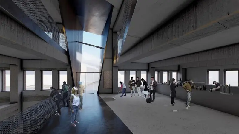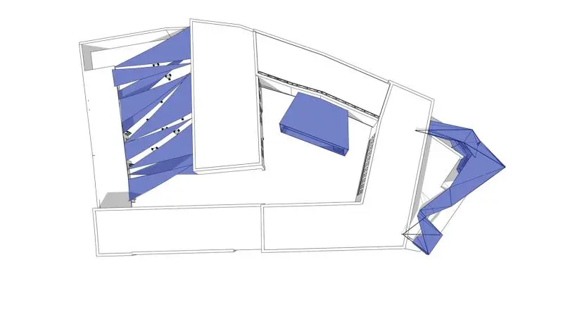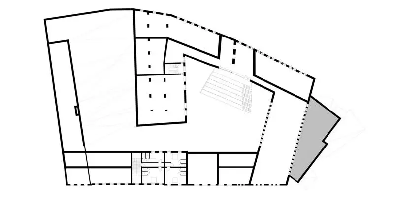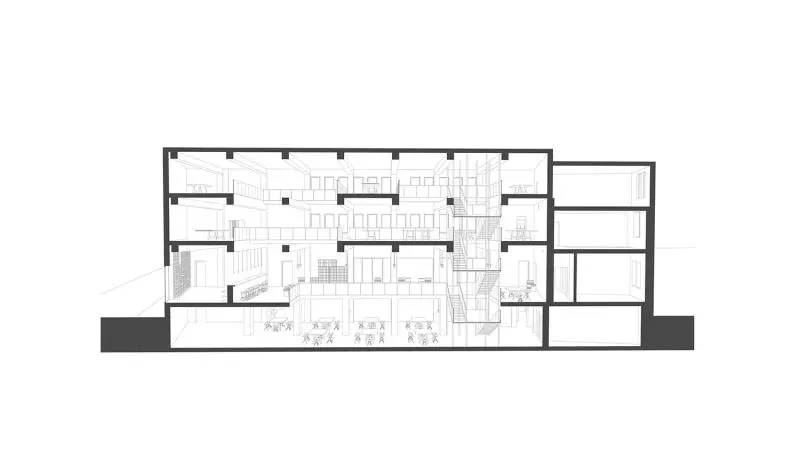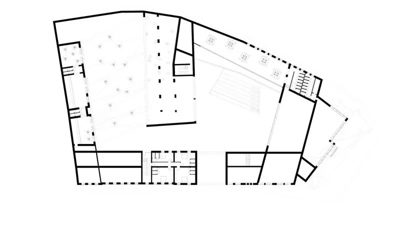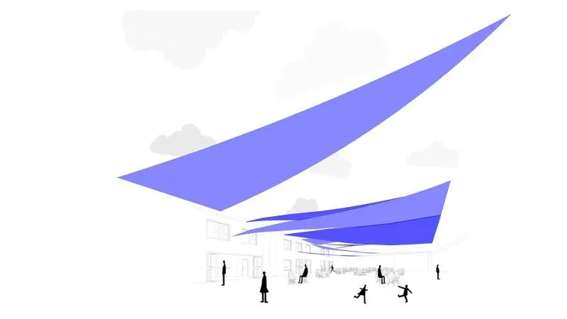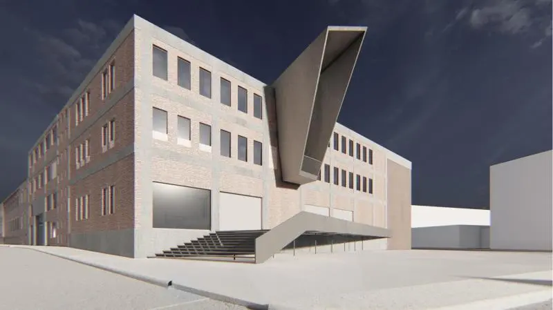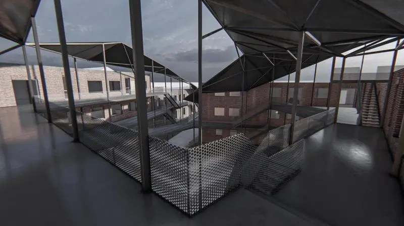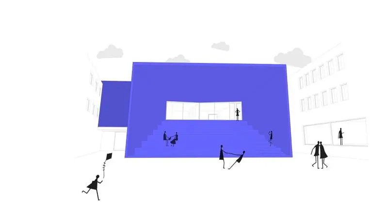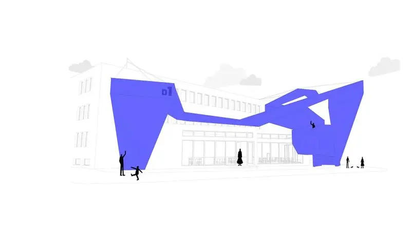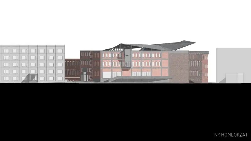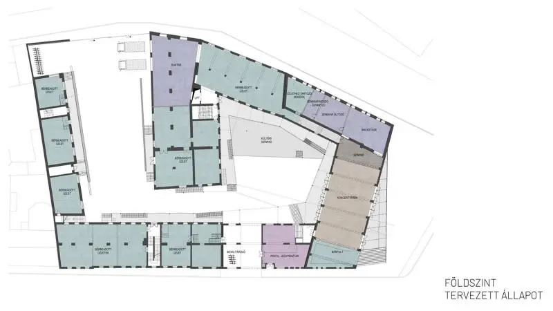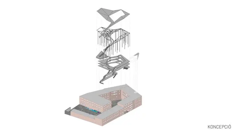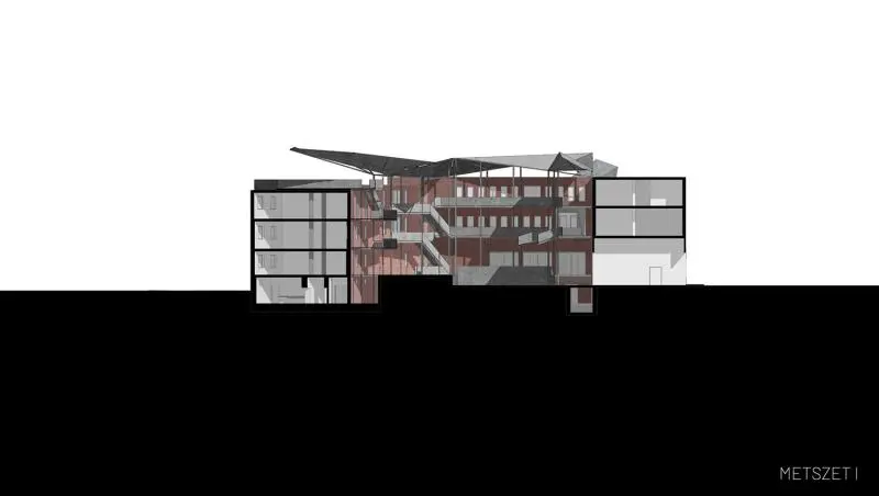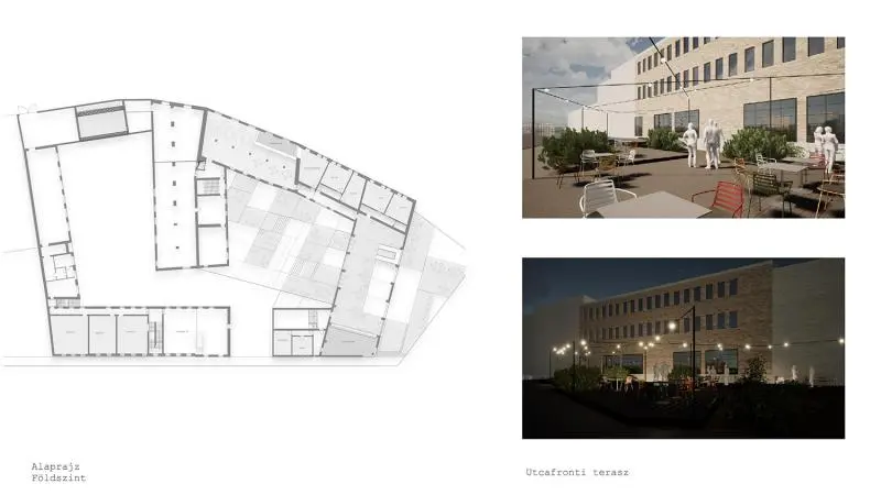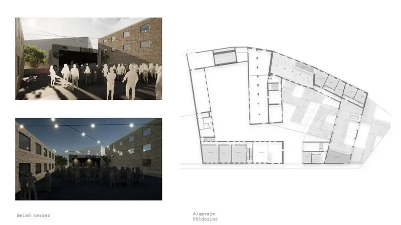 A koncepció középpontjában az épülethez csatlakozó külső terek megújítása állt. A funkció keresése során figyelembe vettem, hogy az épület a belváros és a lakóövezet határán helyezkedik el, így mindenképp olyan közösségi funkciókkal szerettem volna ellátni, melyek képesek csökkenteni ezt a feszültséget, és kiszolgálják a gyermek korosztálytól kezdve akár az egész család igényeit. Az épület középső traktusának földszinti kibontását leszámítva az épületen belül jelentős változás nem történt, kizárólag a válaszfalak jelentős részének bontása által egyszerűsödött, és vált logikusabbá az elrendezés. Az épület 2 belső udvara és a főút felőli térrész 1-1 új objektum által megújult. Az utcafrontra egy figyelemfelkeltő, absztrakt előtető és lépcső került, mely funkcionálisan a 2. emeleti szintre vezeti a látogatót. A Domb utca felől az épületegyüttesbe lépve egy nagy tölcsér fogadja a látogatókat, mely kiemelt bejáratként, emellett közösségi pihenőtérként funkcionál. Egy időszakos színpaddal kiegészülve az udvar alkalmas előadások megtartására, melyek esetén a tölcsér lelátóként funkcionál. A belső udvarok a középső épületrész földszinti bontása által összekapcsolódnak, és a megnyíló hátsó udvar egy nagy teraszként funkcionálva szolgálja ki a közösséget. |