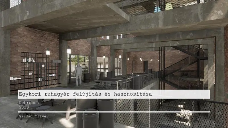 Az egykori ruhagyár épülete a belváros peremén, a kiskörút mellett helyezkedik el. Ezen a területen már nem a korzó hangulat és a fényűző miliő a jellemző. A ruhagyár jelenleg sok, belvárosból kiszorult funkciónak ad helyet: táncstúdió, edzőterem, játszóház, lövészpálya stb. Az épület peremterületen való elhelyezkedése miatt egy alternatív, underground központot alakítottam ki benne, ami a KAPTÁR nevet kapta (az épületben lévő kultikus klub után, és az épület belső udvarának kialakítására utalva). Az épület átformálása dekonstruktív felfogásban történt, ami kifejezi az underground kultúra életérzését. Az épület legfőbb szervezőeleme a belső udvarban kialakított körfolyosó szerű épületelem, amely egy expresszív formálású tetővel lett lefedve. A szintek közötti közlekedés és az üzletek elérése is erről a folyosórendszerről történik. A belső udvar koncertudvarként is, a körfolyosó pedig lelátóként is funkcionál. A körfolyosó és annak lefedése a meglévő épület anyaghasználatától eltérően acél szerkezetből van kialakítva, így az új és a régi épületelemek jól elkülöníthetőek. Az acél szerkezet néhány helyen „kitüremkedik” az utca irányába a meglévő épületen keresztül. A pinceszinten zenestúdió és próbatermek kapnak helyet. Ezeknél a funkcióknál nincs szükség nagy méretű bevilágító ablakokra. Ezek a pincehelységek a körfolyosó alatt kialakított fedett nyitott folyosóra nyílnak. A Burgundia felőli épületrészben beltéri koncertterem kap helyet és az ezt kiszolgáló backstage, bárpultok stb. Ezeken kívül az épület legtöbb helyiségének nem lett kijelölve konkrét funkció. Ezek olyan üzleteknek lennének fenntartva, amelyek az underground kultúrához kapcsolódnak: gördeszkabolt, tetoválószalon, hangszerbolt, lemezbolt, kocsmák stb. |