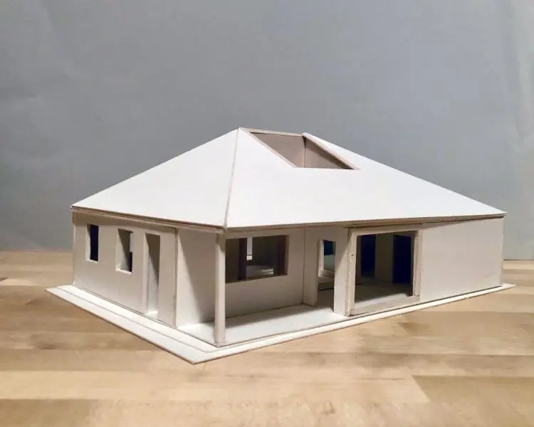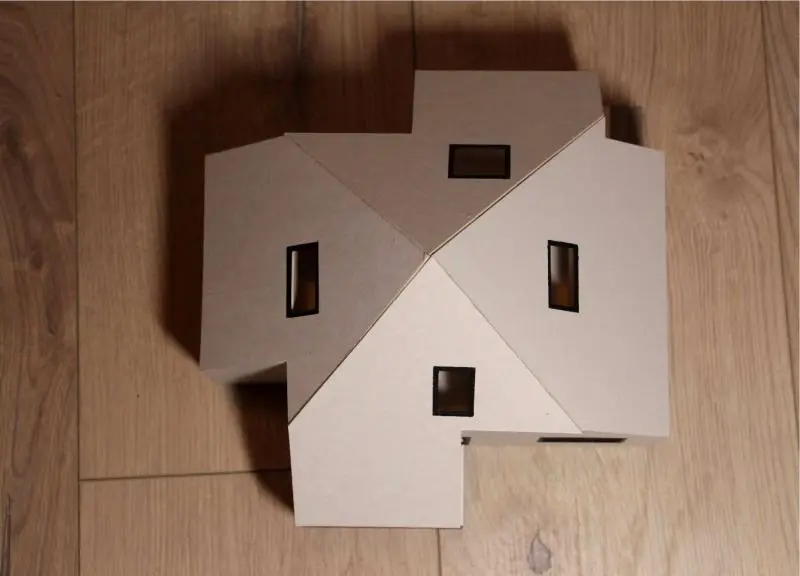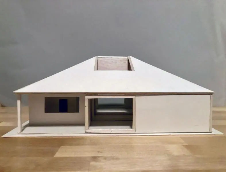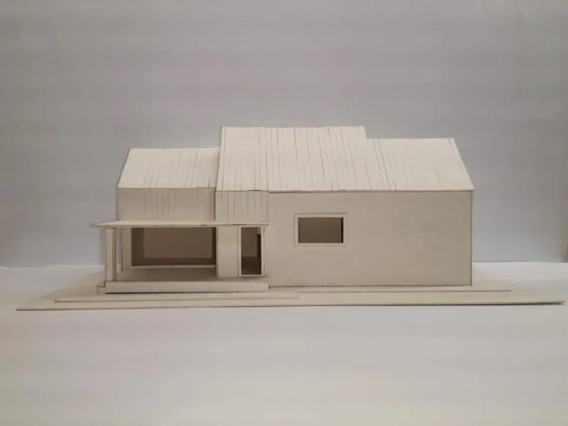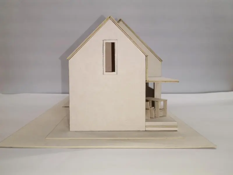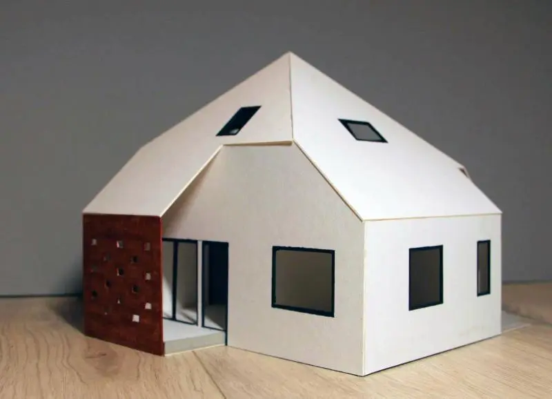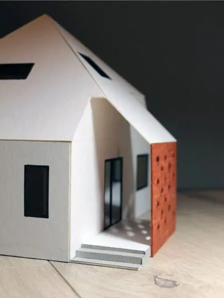 Az épület tömegének az alapját egy négyoldalú hasáb és a ráhelyezett egyszerű sátortetős lefedés adta – néhány részt azonban kivágtunk a formából, így változó homlokzatimegjelenést kapott a nyaraló.
