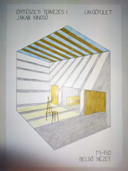A félév első feladata fiktív helyszínre készül, a tervezés gyújtópontja pedig fotó, egy meglévő épület belső teréről. A fotó hangulata, a fény-árnyék dinamikája, a téri játék adja az inspirációt, a kép mögötti tér-tömeg meghatározása és újraértelmezése a tervezési feladat. A kép csak egy irány, egy origó, mely számtalan koncepció lehetőségét rejti magában. A másodéveseknek lakó-funkcióban, a harmadéveseknek közösségi-funkcióban kellett gondolkodniuk. Olyan témákat, élethelyzeteket vagy szakmákat kellett keresniük, amelyek mögötti funkcionális tartalom összeegyeztethető volt a belső téri szituációkkal.