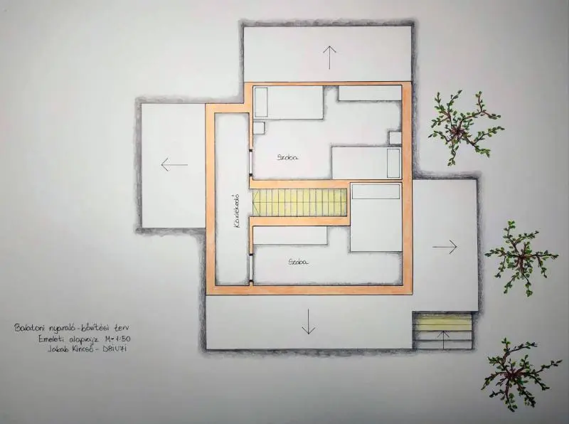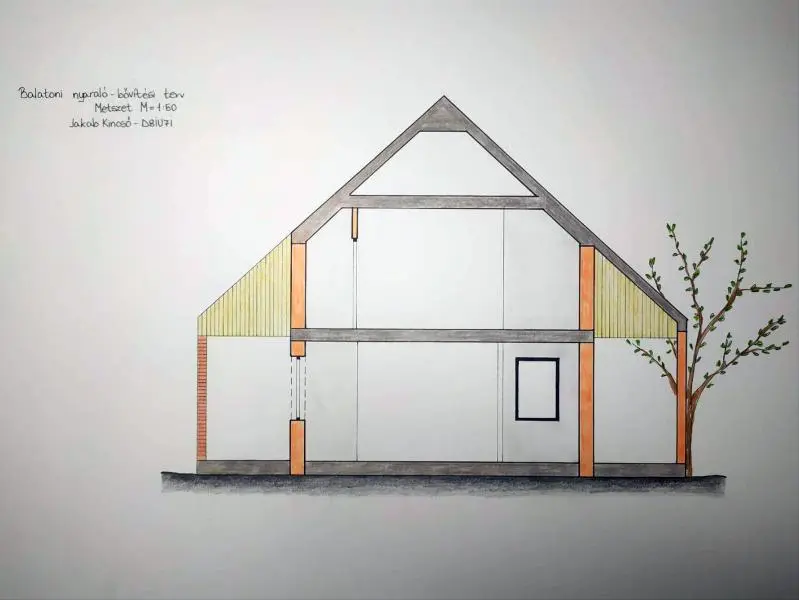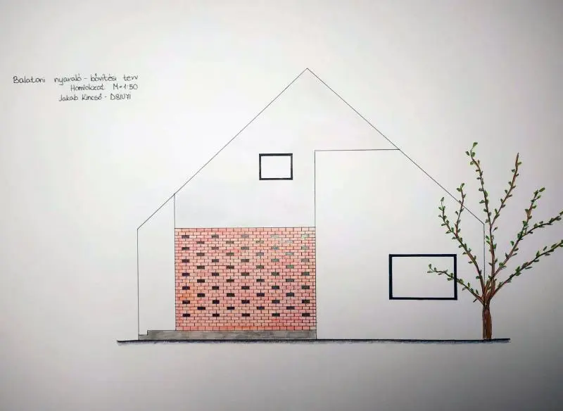A Balatonról pár száz méterre fekvő nyaraló bővítésének tervezése soránfontos szempont volt számomra, hogy minél nyitottabb legyen a környezet feléa ház ablakaival, melyből a lehető legtöbbet kívántam elhelyezni rajta.Emellett két terasszal bővítettem a nyaralót, hogy a látogatók bármikorkiülhessenek és gyönyörködhessenek a természetben és a Balatonban. Anyagjaival, és formájával is a környezetbe való beleolvadást szerettem volnaelérni. A vakolt falakon a barna több árnyalatával, a tető vonalasságával, afaanyag több helyen való használatával hangsúlyoztam a természethez való közeledést, és a nyugalom érzetének megteremtését. A tervezés folyamán két fontos érzést szerettem volna megteremteni a házikóban: a nyugalmat a Balatoni városok forgataga ellen, és a csendet a természetben.