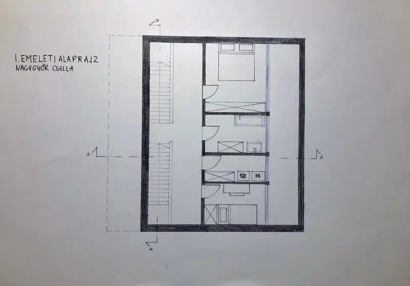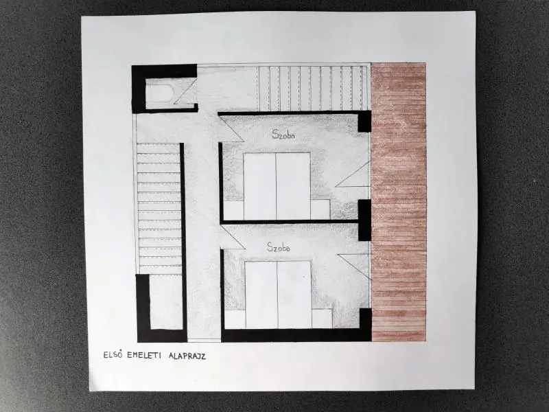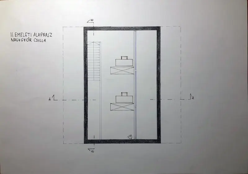 Az emeleten kapott helyett két hálószoba, egy privát háló és egy másik, közös hálótér,valamint az összekötő folyosó. A tetőtér megvilágítását négy tetőablak biztosítja, az egyik, aprivát háló ágya felett nyílik, lehetőséget biztosítva az esti csillagvizsgálatra. Ezzel szembennyílik egy lépcsőteret megvilágító ablak, valamint az erre merőleges tengelyen még egy-egy, mindkét oldalt. Ezt fontosnak tartottam amiatt, hogy az emelet tetőtéri jellege ne váljonnyomottá.