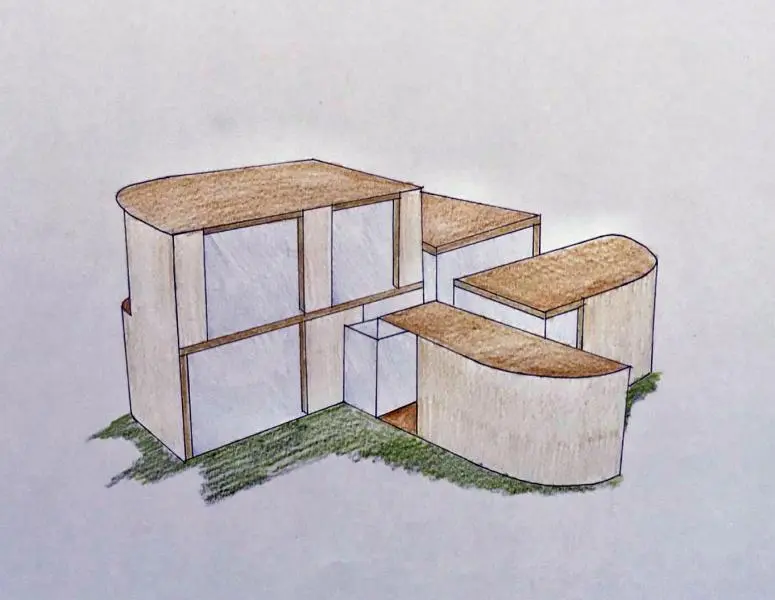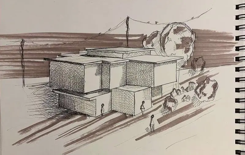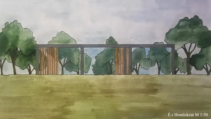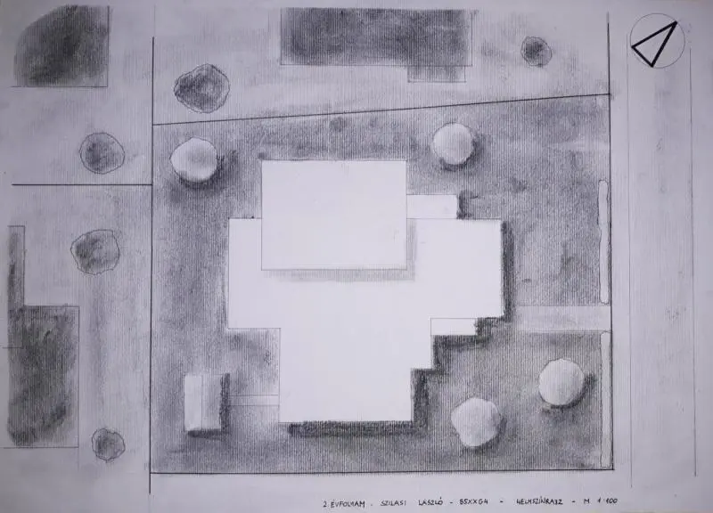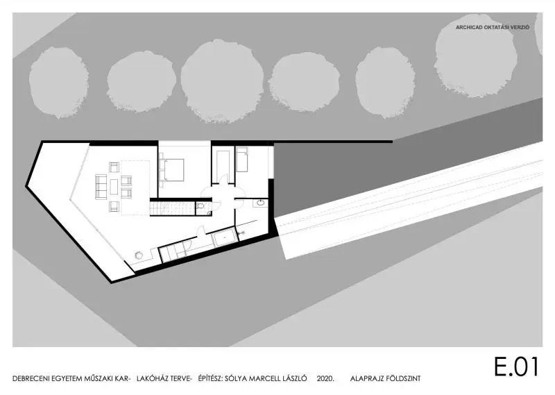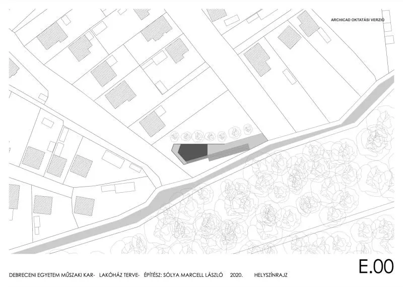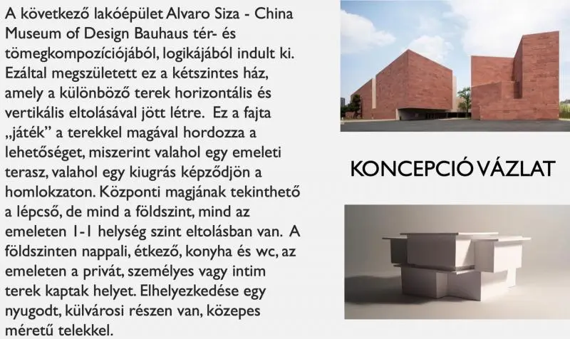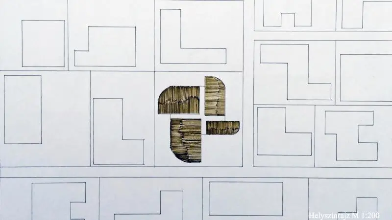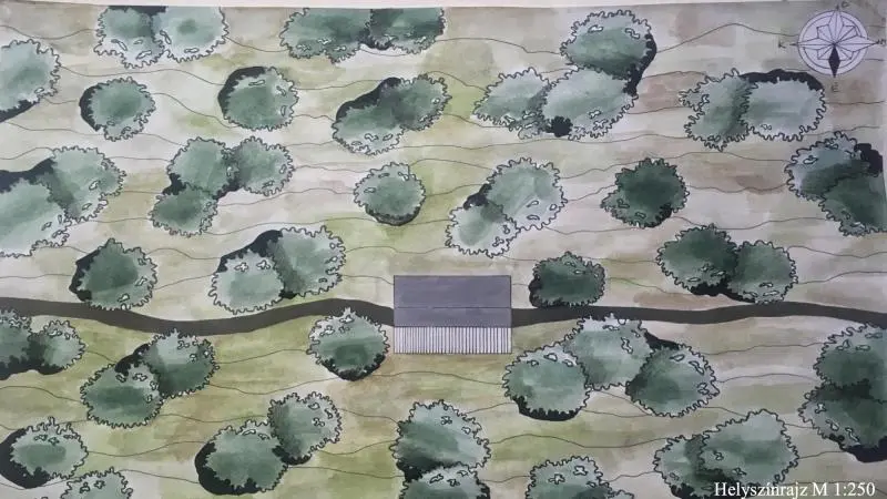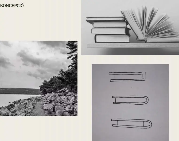 A feladat a képen látható területen, egy hívogató, a természetre reagáló lakóépület létrehozása. A tervezést az épület környezetben való elhelyezésével kezdtem. Megállapítottam, hogy a helyszínt 3 fő részre lehet bontani: Ezzel párhuzamosan lett előttem egy könyvnek a képe; pontosabban a formája. Hiszen a kemény borító védelemmel szolgál, a gerinc része pedig egyfajta lezárása. Az én leendő épületemnek, ha egy könyvhöz hasonlítjuk, a gerincénél lesz a bejárat, hisz a könyvek gerincén feltüntetik a címet, de a valódi izgalmak a két borítólap között találhatóak. Miután megfogant a könyv forma, egy kicsit fakónak, tompának éreztem. Emiatt az épület „gerincét” egy félköríves lezárásra módosítottam, ami lendületet biztosít. Mivel a könyvek valódi értéke a borítók között található, ezért a lakóteret is ilyen szinten igyekeztem ellátni, megvalósítani. |