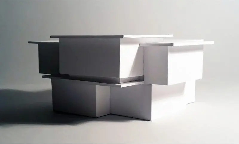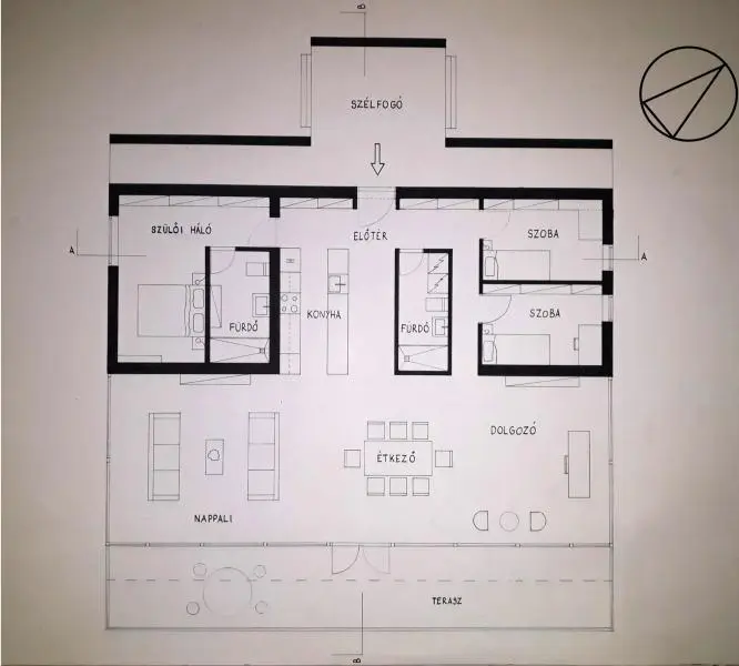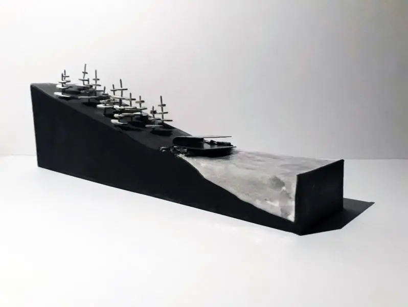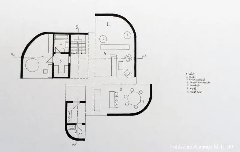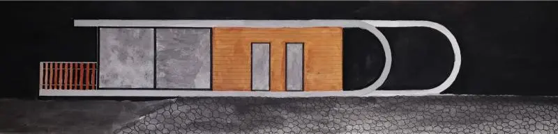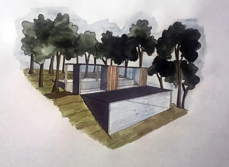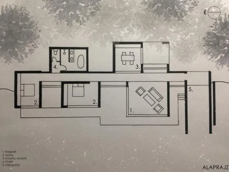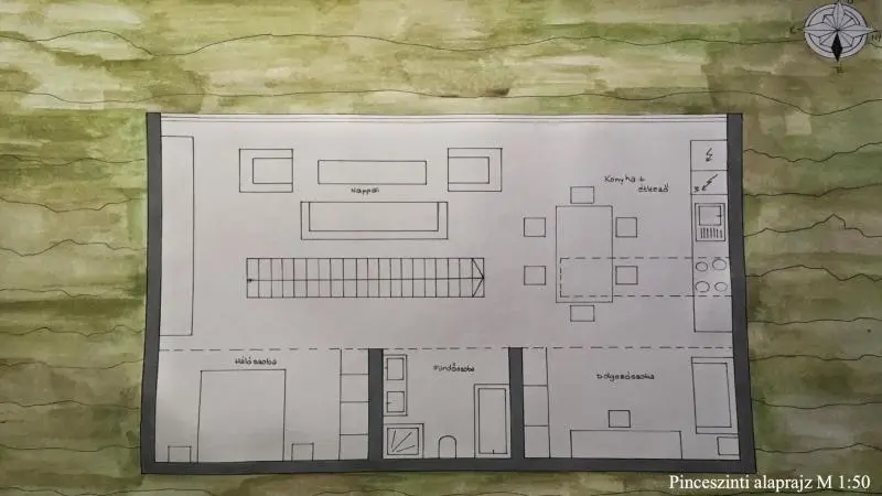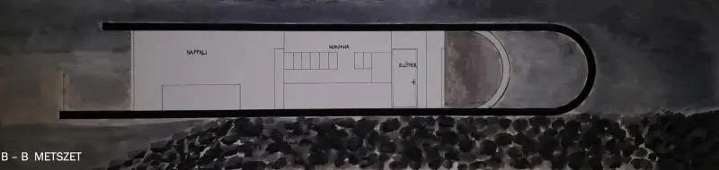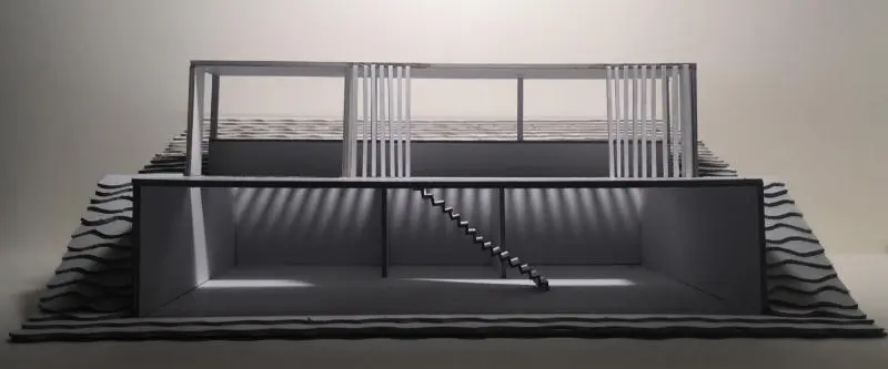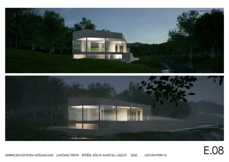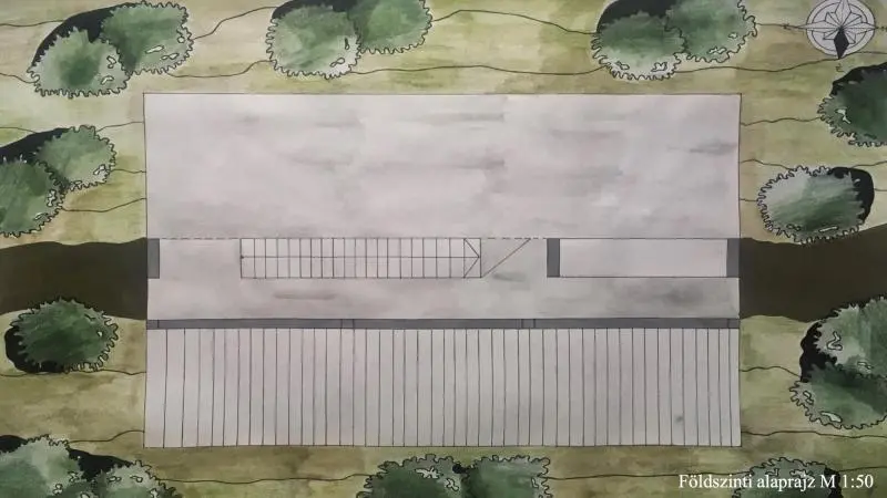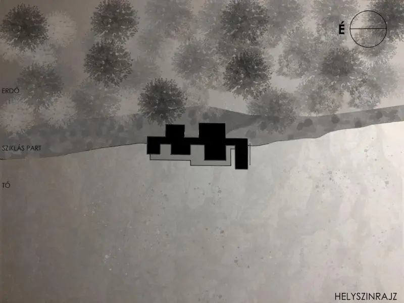 A feladatban egy sziklás tópartra kelletttervezni, ahol a tájjal való kommunikáció volt fő szempont. A nyaraló a tó és a sziklás part között helyezkedik el, próbálja felvenni a sziklák formáit. Az épület közepén egy fa burkolatu folyosómegy végig, ami anyaghasználata az erdővel próbál kapcsolatot teremteni, ebbecsatlakoznak a fő funkciós helyiségek,amiknek nyersbeton felületei vannak. A helyiségek főleg a tópartra nyitnak, ami A nyaralóhoz tartozik egy hajógarázs is, ami egy kisebb csónakot képes eltárolni. |