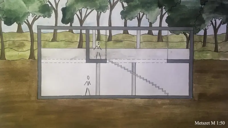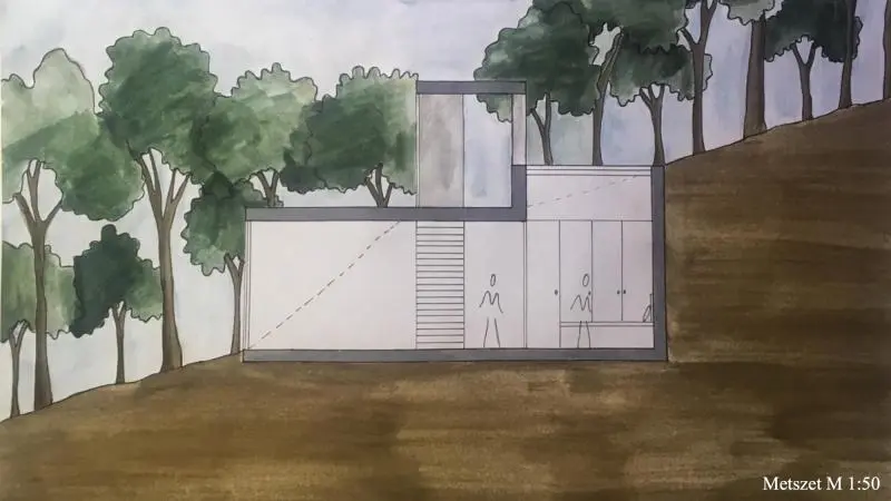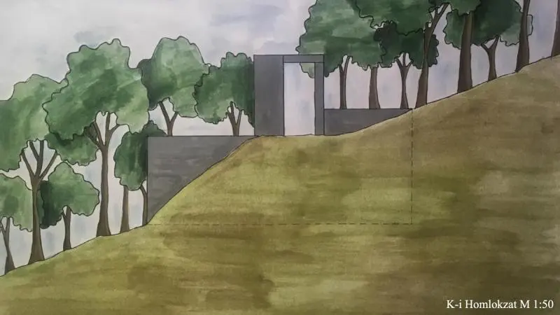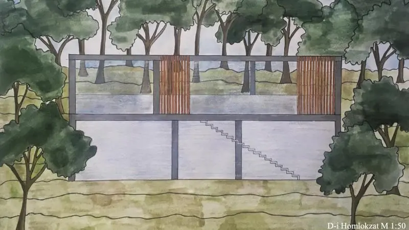 A félév harmadik tervezési feladatának egy igen fontos kiindulási pontját maga a jól meghatározott helyszín adta,hiszen ahogyan a mellékelt képenis látható egy erdei,dombos helyszínről van szó.Az adottságokat figyelembe véve született meg az általam tervezett lakóház is.Az erdő játékos hullámzásába lett beleolvasztva az épület úgy,hogy a lehető legkevesebbet vegye el a természettől és ugyanakkor a lehető legjobbantudjon beleilleszkedni az adott domborzatba.Részben arra törekedtem,hogy a már meglévő erdei út irányát ugyanúgy megtartsam és az épületmegépítése után ne kelljen máshol elvezetni azt,így az épületem úgy lett kialakítva és megtervezve,hogy továbbra is használni lehessen az utat.Alentiekben csatolt képeken megfigyelhető,hogy ennek köszönhetően a lakóház beélt tere el van süllyesztve.Az erdei útról letérve egy lépcsősegítségével tudunk lejutni a lakótérbe,melynek a hatalmas üvegfalnakköszönhetően intenzív kapcsolata van a természettel,környezettel,mégakkor is,ha nincsen egy külön erre szánt terasz.A lakóház maga annak ellenére,hogy egy domb oldalba besüllyesztett épület, egy világos tér.Eza világosság a változatos nyílásoknak,bevilágítóknak köszönhető,így nem keletkezik egy nyomasztó,sötét belső világ. |
