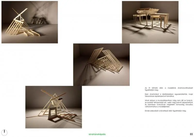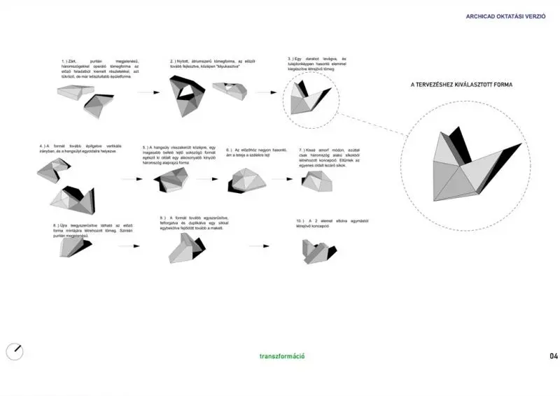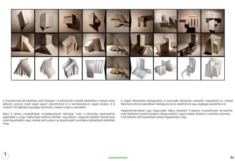 A harmadik feladat egy választott térbeli forma átdolgozásáról, annak transzformálásáról, kvázi épület-tömeg variációk készítéséről szólt. A feladat forma-készség fejlesztő gyakorlat. Az objektre mint tárgyra gondoltunk, egy hevenyészett tömegmodellre, ami már közelít az épített formához. Ennek dokumentálása szintén makettben, majd rajzban történt. Hangsúlyt kapott az úgynevezett evolúciós-makett sorozat, csakhogy itt inverz módon, az összetettebb formáktól kellett haladni az egyszerűbb felé.