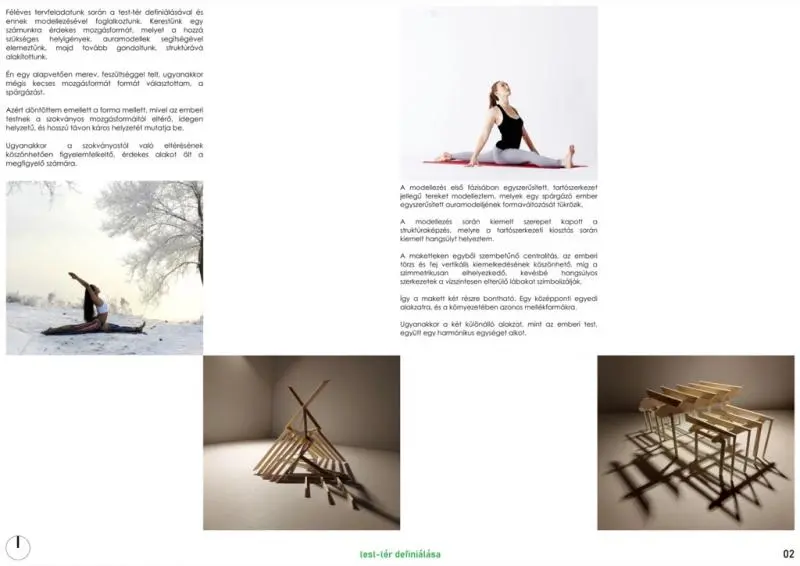 Az első feladat az úgynevezett aura-tér fogalmát járta körül, rajzok és a végén makettek készültek, egyszerű és/vagy bonyolult formai lekövetések, melyek az emberi test anatómiájára, kiterjedésére reflektáltak.