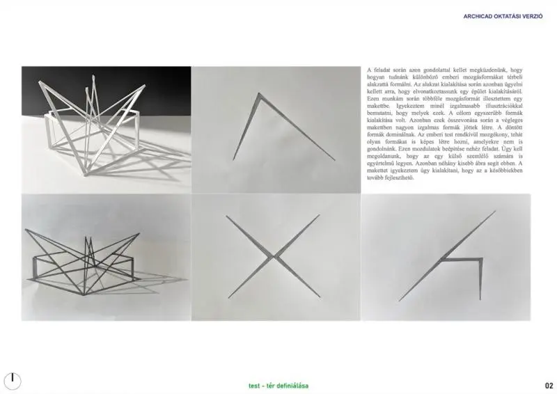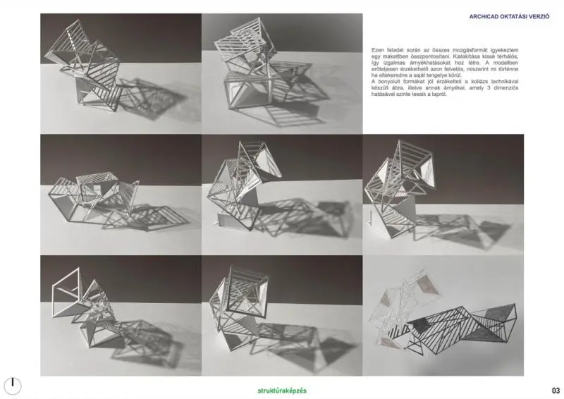 A második feladatban az első feladat egyik egyszerű térbeli formáját bontottuk tovább struktúra-képzés alkalmazásával. A struktúrának már közelítenie kellett egy lehetséges épület-vázhoz (formához). A makettek így léptékbe kerültek.